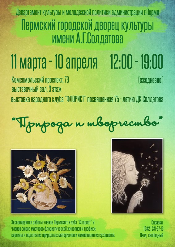Открытие выставки «Природа и творчество» ⏰11 марта (ср), в 12:00 📍ДК Солдатова, Комсомольский пр., 79 💵Вход свободный Посетители выставки смогут увидеть уникальные картины и поделки из природных м