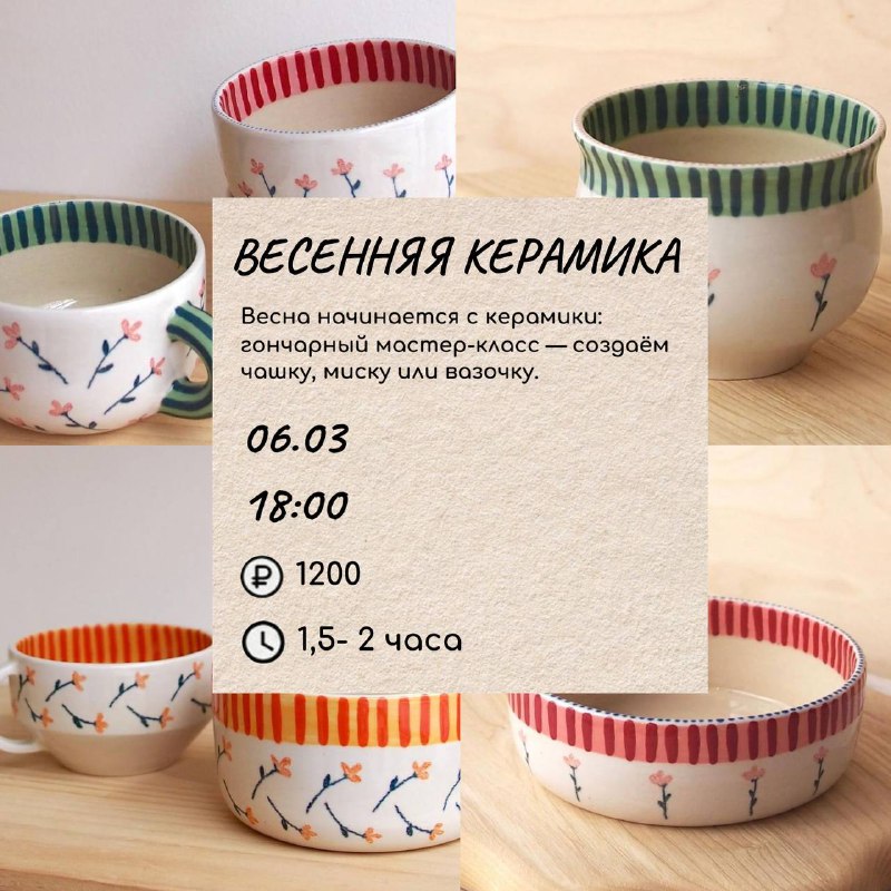 📌Афиша мастер-классов в керамической мастерской. Занятия проходят в Пермской арт-резиденции 🌸Расписание мастер-классов на март: 📆6 марта (18:00) — мастер-класс «Весенняя керамика» за гончарным