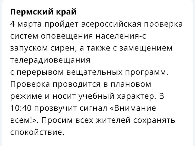 На всякий случай напомним, что сегодня пройдет комплексная проверка систем безопасности. Сигнал мы должны услышать с 10:40 до 10:45 🔴 Подписаться | Написать нам