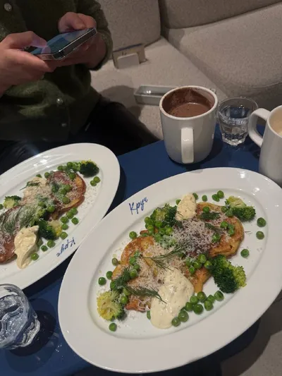 Наконец-то добралась до этого кафе 💙 Очень давно хотела сюда попасть. Здесь невероятно вкусно (к еде вообще никаких претензий), но есть один нюанс — столики тут такие микроскопические, что приходит