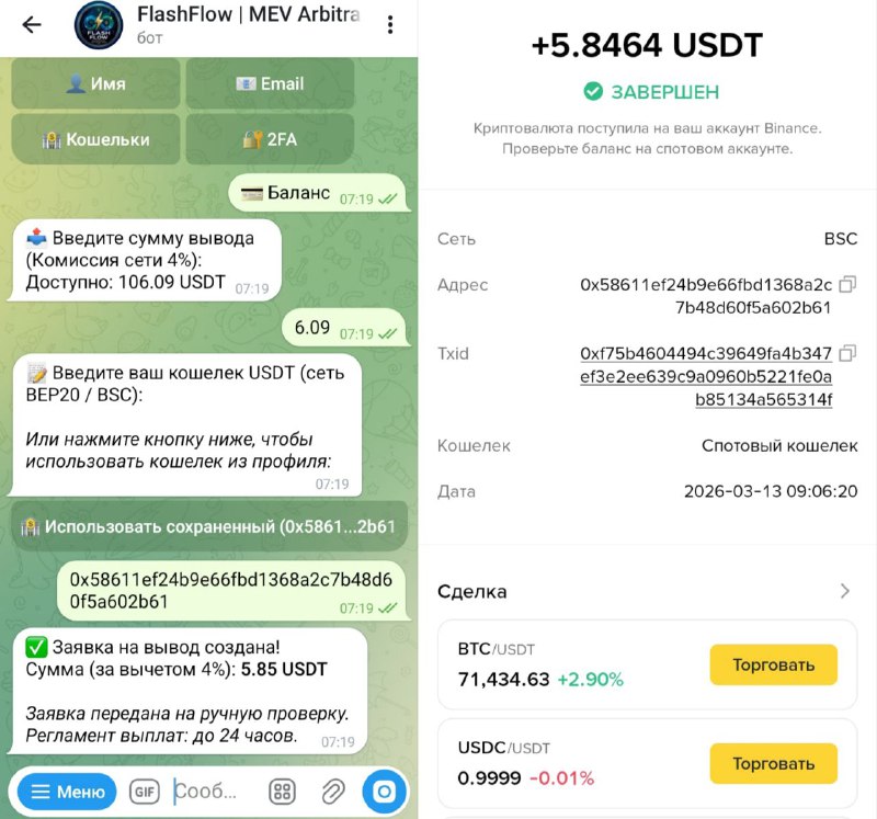 ✌️Как и обещала, делюсь с вами выводом с проекта FlashFlow. Запуск 03.03.26 🕞 Мои вложения 100$. За 2 дня прибыль 6.09$ с реинвестом на 24 часа брала тариф. Напоминаю, депозит выводной в любой момент