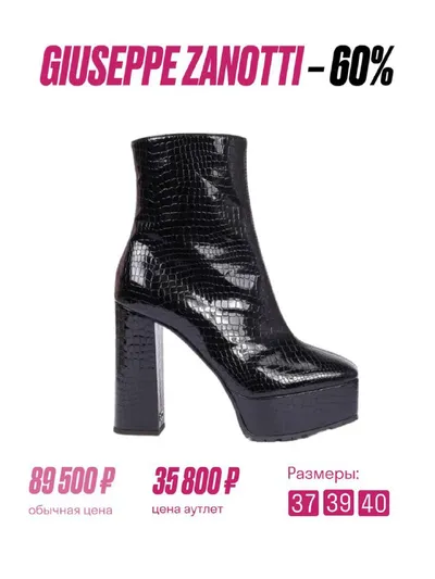 Скидка 40% на избранные модели обуви GIUSEPPE ZANOTTI 🤍 Создайте незабываемый образ для праздничного вечера 🌷 Правила приобретения товаров в аутлете. Чтобы уточнить наличие интересующей позиции,