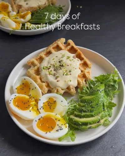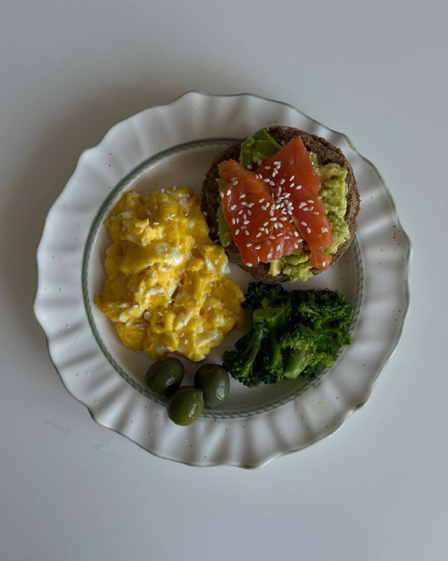 Варианты завтраков 🥰 1️⃣ яйца всмятку, авокадо, руккола, вафля, йогурт / крем-соус, семена кунжута 2️⃣ омлет, бейгл с ветчиной, шпинат, персик 3️⃣ яйцо, тунец, огурец, помидоры черри, фета, шпинат