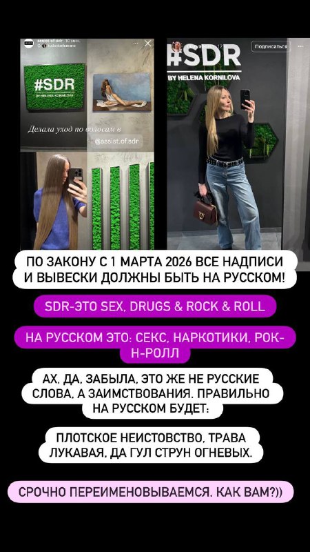 Салон по уходу за бабьими космами “Плотское неистовство, трава лукавая, да гул струн огненных”. Приглашает сударынь на убранство волос, да попечение кос. До 11 марта действует акция в честь дня бабьег