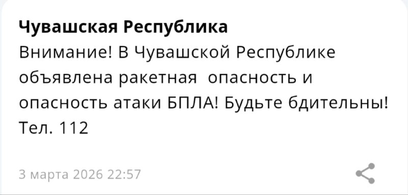 🗣МЧС: Внимание! В Чувашской Республике отбой ракетной опасности. Тел. 112 Наш канал в Мах
