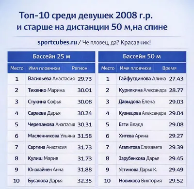 Лучшие девушки сезона (2008 г.р. и старше) на 50 метров на спине — серьёзная конкуренция! В короткой воде топ возглавляет Анастасия Васильева из Якутии с результатом 29.73, а в 50-метровке лучше всех