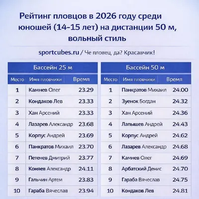 Рейтинг юношей 14-15 лет на 50 метров вольным стилем за 2026 год — пацаны огонь! 🔥 В короткой воде лидирует Олег Камнев с 23.29, буквально на сотые доли от него Лев Кондаков и Арсений Хан, а в длинно