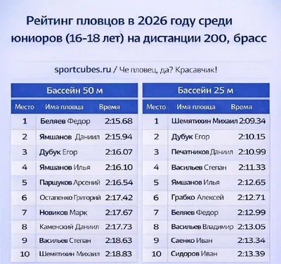 Российские юниоры на 200м брасс: есть над чем работать 💪 После истории с Шином Охаси (Япония, 2:06.59 — юниорский МР) — вот как выглядит Россия на 200м брасс! ТОП-5 РОССИИ (16-18 лет, 50м): 🥇 Фёдо
