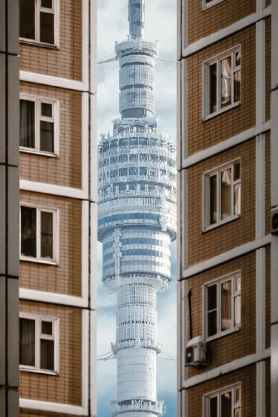 Останкинская башня между домами Один из известных ракурсов на Останкинскую башню. Здесь создаётся ощущение, будто она зажата между двумя домами, хотя на самом деле до неё около 1,2 км. А если присмот