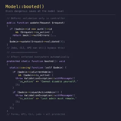 Знаете ли вы, что можно использовать Model::booted(), чтобы выбрасывать ValidationException и блокировать опасные сохранения? Например, можно предотвратить ситуацию, когда администратор отключает сво