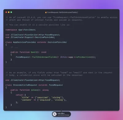 Начиная с Laravel 13.4.0, вы можете использовать FormRequest::failOnUnknownFields, чтобы включить выброс ошибок в случае, если в запросе передаются неизвестные поля! Как думаете, вы бы использовали э