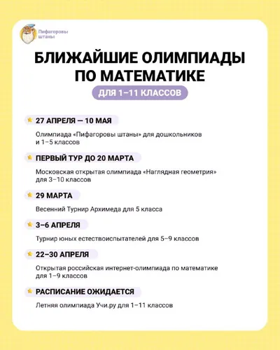 🌿 БЛИЖАЙШИЕ МАТЕМАТИЧЕСКИЕ ОЛИМПИАДЫ ДЛЯ 1–11 КЛАССОВ 🌿 Мы подготовили список весенних олимпиад для всех возрастов — от младшей школы до старших классов. Если ваш ребёнок любит нестандартные зада