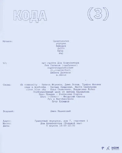 Параллельная кода (3) 5 апреля 16:00-22:00 Дом Архитектора (Большой зал) Описание проекта: Архитектурно-музыкальное исследование параллельной, бумажной стороны архитектурной практики, проекта и