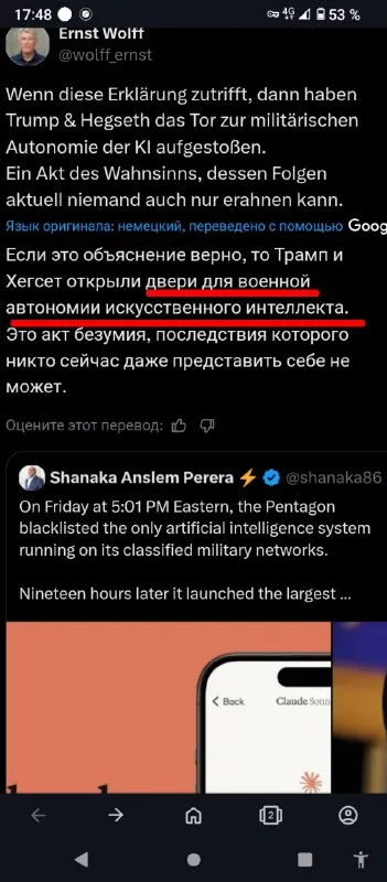 https://x.com/wolff_ernst/status/2028005297789276313 Если это объяснение верно, то Трамп и Хегсет открыли дверь к военной автономии ИИ. Акт безумия, последствия которого сейчас никто даже представить