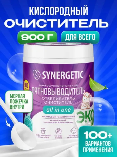 Кислородный пятновыводитель SYNERGETIC Тот самый универсальный порошок, который используют и для стирки, и для уборки дома Подходит для одежды, ковров, мебели, посуды и кухонных поверхностей Хорошо