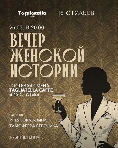 «Месяц женской истории» проходит в ресторане 48 Стульев По этому поводу 26 марта пройдет гостевая смена Tagliatella Cafe, (сноска автора 😉 бар, где все бармены только девочки) Бар-леди подготовят