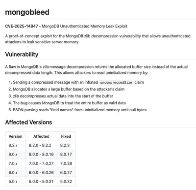 ➡️ MongoDB Memory Leak Exploit (CVE-2025-14847) Прототип эксплойта для уязвимости в MongoDB, позволяющий неаутентифицированным злоумышленникам утекать конфиденциальную память сервера. Уязвимость связ