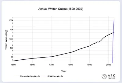 ➡️ Хорошая это новость или грустная, судите сами: ARC Invest посчитали, что к концу 2020-х суммарный объем текста, сгенерированного ИИ, превзойдет объем текста, который человечество накопило за после