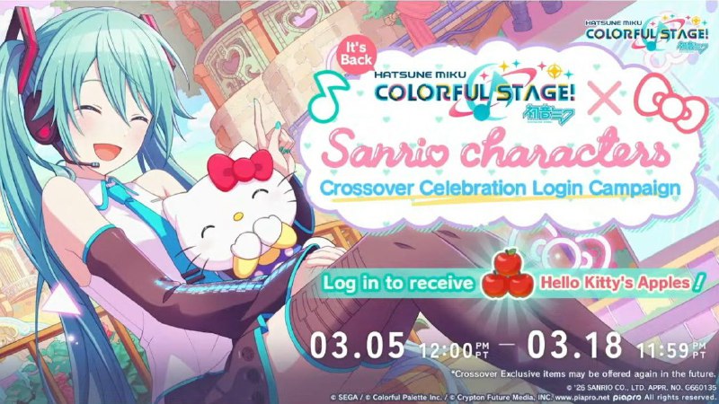 🌎🔔 Специальный логин-бонус в честь повторной коллаборации с Sanrio! Всем игрокам, зашедшим в игру с 5 по 18 марта, будут выданы яблочки, восстанавливающие 10 энергии! #en_game