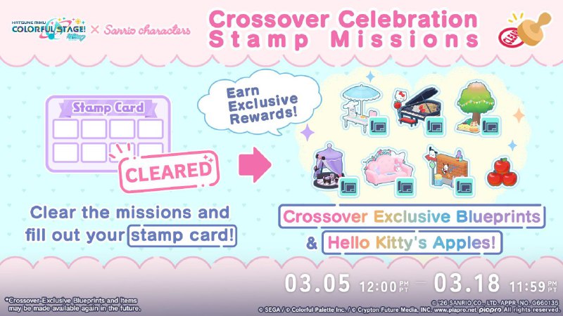 🌎🔔 Перевод всех штамп-миссий в честь повторной коллаборации с Sanrio! Выполните все миссии, чтобы получить новые чертежи мебели для My SEKAI и яблочки, восстанавливающие 10 энергии. Перевод штамп