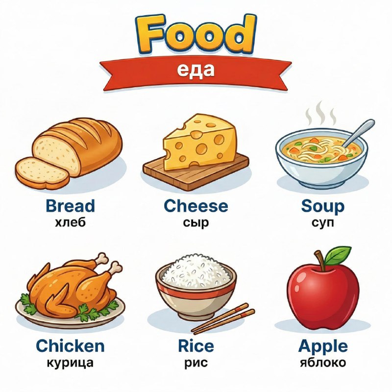 Полезные слова из категории Еда! 🟠Food [ fud ] – еда 🟠Bread [ brɛd ] – хлеб 🟠Cheese [ ʧiz ] – сыр 🟠Soup [ sup ] – суп 🟠Chicken [ 'ʧɪkən ] – курица 🟠Rice [ raɪs ] – рис 🟠Apple [ 'æpəl ] – яблок