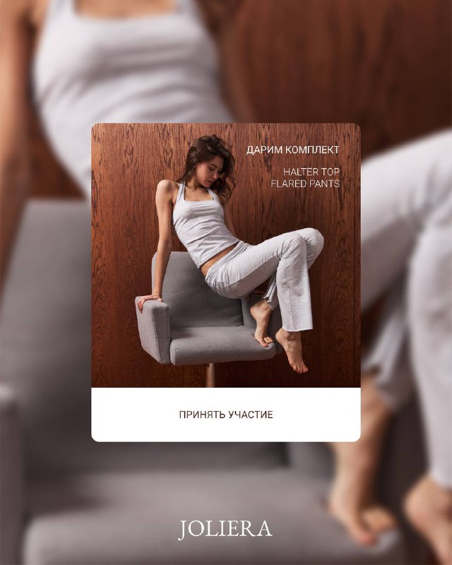 Дарим комплект из новой коллекции 🏹 HALTER TOP & FLARED PANTS Условия: Подписаться на канал @jolieraru Проявлять активность Нажать «участвую» Итоги - 15.04 Приз и доставка за наш счет! 🤍