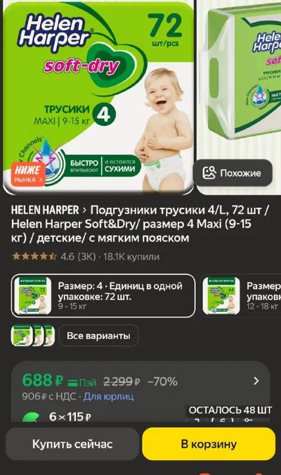 9-15 кг подгузники 72 шт за 688 ₽ 🔥 Подгузники трусики 4/L, 72 шт / Helen Harper Soft&Dry/ размер 4 Maxi (9-15 кг) / детские/ с мягким пояском https://market.yandex.ru/cc/98orMv?erid=5jtCeReNx12oaj