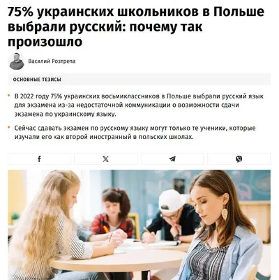 В Польше в 2022 году около 75% украинских восьмиклассников выбрали русский язык для экзамена вместо украинского. Об этом заявил доцент Института славистики Польской академии наук Павел Левчук в интер