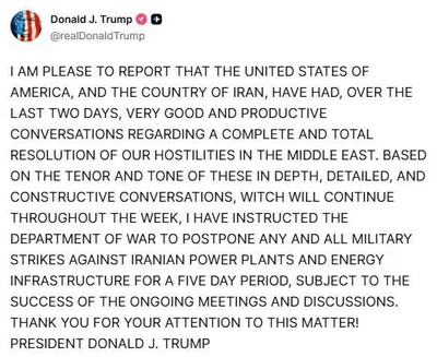 🇺🇸🇮🇷 Трамп объявил пятидневную паузу в ударах по энергетике Ирана Президент США написал в Truth Social, что поручил Министерству обороны отложить любые военные удары по иранским электростанциям и