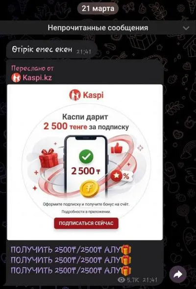 Вот так сейчас взламывают Telegram. На этой неделе уже 6 сообщений пришло. От ваших близких и знакомых приходит сообщение с якобы подарком от Kaspi со словами "өтірік емес екен". Кто перейдет по ссыл