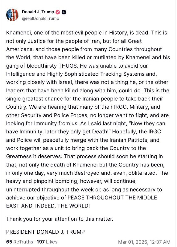 ▪️▪️▪️ Дональд Трамп сообщил, что верховный лидер Ирана Али Хаменеи мертв. "Он не смог ускользнуть от нашей разведки и высокотехнологичных систем слежения. Ни он, ни другие лидеры, погибшие вместе с