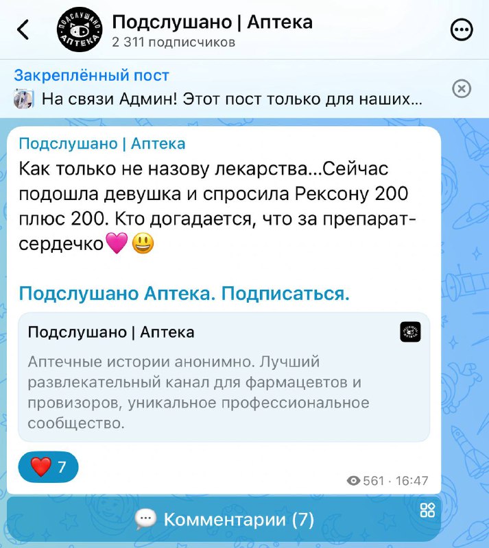 МедицинаАптечные истории анонимно Лучший развлекательный telegram-канал для фармспециалистов по версии народной премии "Взгляд из Аптеки" - https://vk.cc/cPGhFs Предложить новость/Связь с админом/Купить рекламу - @podslushano_apt_bot Регистрация в Реестре РКН ✅