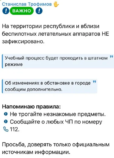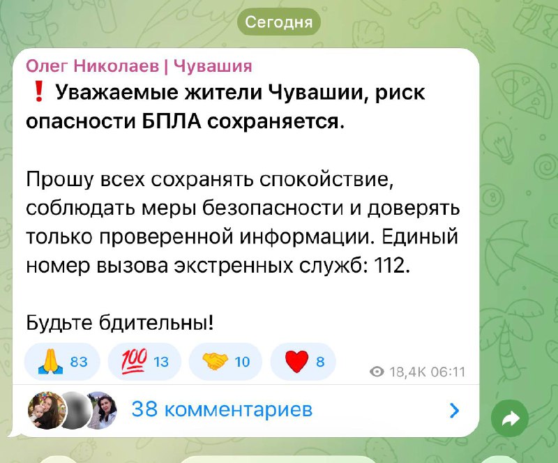 ❗️ Глава Чувашии сообщил о сохраняющемся риске угрозы БПЛА и призвал жителей региона сохранять спокойствие, соблюдать меры безопасности. 📲 Дублируем новости в MAX 📣 Прислать новости