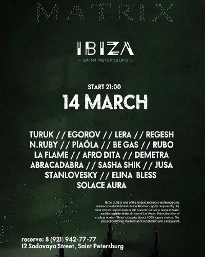 ммм ага на тусовку заходи ммм ага лайк поставь если выбрал куда 🟣Matrix — Ibiza 🟣Time of Night — Севкабель Порт 🟣Опыт андеграунда — Blank 🟣Камбэк — Commode 🟣Bunga Bunga — Юнион 🟣Voice pow
