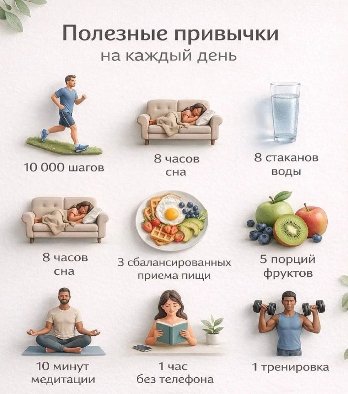 Базовый чек-лист заботы о себе • 10 000 шагов — для активности, здоровья сердца и хорошего настроения. • 8 часов сна — основа восстановления и гормонального баланса. • 8 стаканов воды — энергия, чист