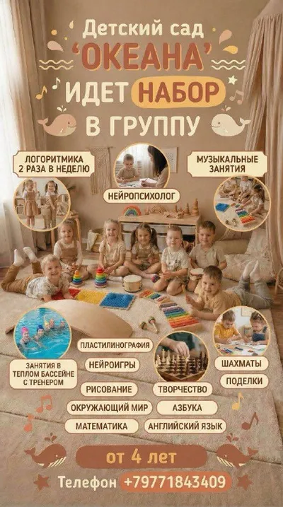🐳 Детский сад «Океана» приглашает малышей! Ищете детский сад? Места в яслях и группах есть уже с этого марта. В частном саду «Океана» мы создали безопасную и теплую атмосферу, чтобы доверить нам сам