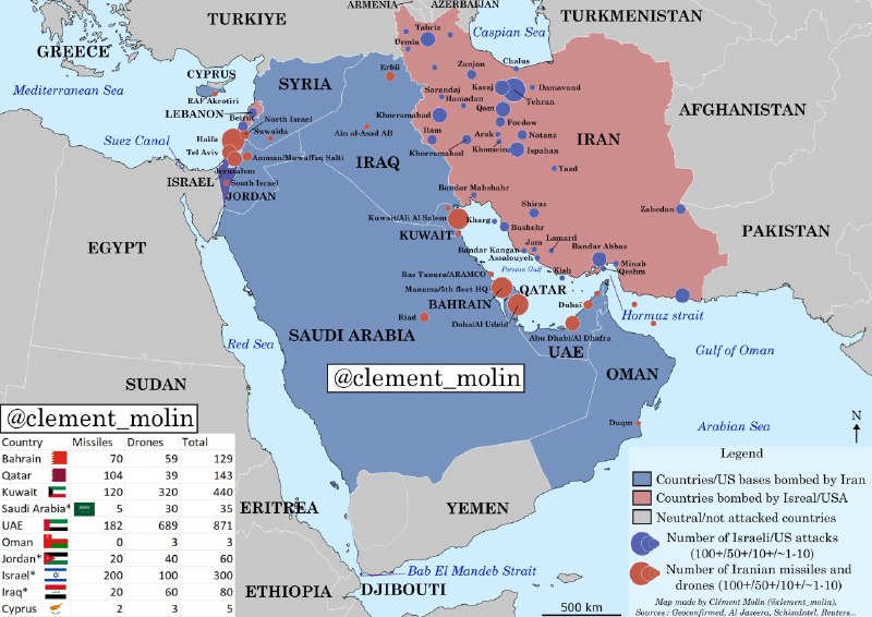❗️Карта ударов западной коалиции по иранской территории, а также ответные атаки Тегерана по всему Ближнему Востоку на четвертый день боевых действий. США и Израиль нанесли более 2500 ударов по более
