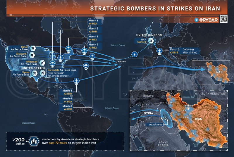 🇺🇸🇮🇷 Применение стратегических бомбардировщиков ВВС США для ударов по территории Ирана. За последние 72 часа по иранским целям нанесено более 200 ударов. @poisk_mil