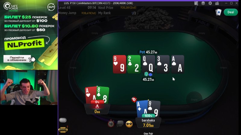 Пока мы жалуемся на диспу где-то в оффлайне... 😐 ... кладут однокарточное каре с флопа