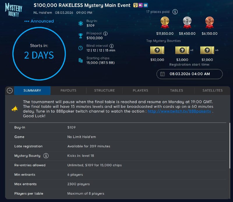 🎱 888poker проведёт $109 Mystery Main Event $100K GTD без рейка Главный еженедельный турнир 888poker стартует 8 марта в 21:00 МСК. Топ мистери баунти = $10K. Выиграть билет можно в сателлитах, на