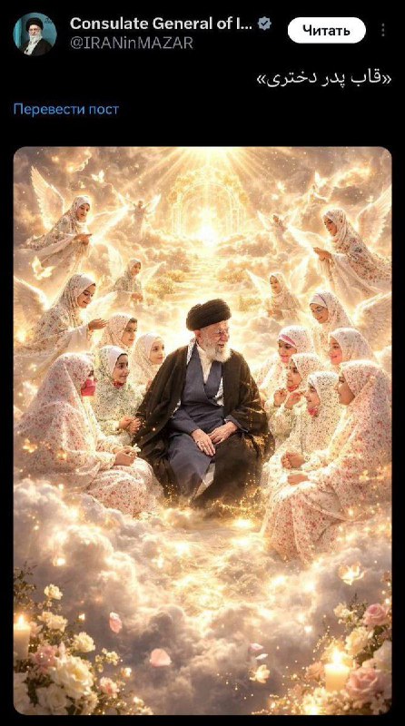 В официальном аккаунте аятоллы Хаменеи опубликовали его картинку в раю с гуриями, которых изобразили в виде маленьких девочек. Видимо, после смерти он попал на остров Эпштейна