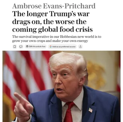 ⚡️Продолжение конфликта с участием Трампа негативно скажется на мировом продовольственном кризисе, как сообщает The Telegraph. Поставки мочевины, аммиака и серы были временно остановлены на 27 дней в