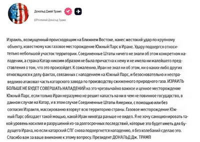 Трамп утверждает, что США не знали о планах Израиля атаковать иранское месторождение Южный Парс, как и Катар не был вовлечен и не подозревал об атаке. Президент США пообещал, что Израиль больше не бу