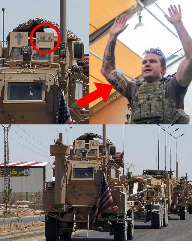 Надпись "Kafir" по-арабски означает "неверный" или "отрицающий [веру в Аллаха]". В последнее время её заметили и на американской бронетехнике. У министра обороны Пита Хегсета на правом бицепсе так ж