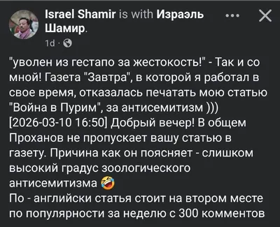 Статью этнического еврея Проханов запретил печатать за её "зоологический антисемитизм". Некоторым людям старой закалки трудно поверить и признаться себе, что сионисты в своём расизме смогли переплюну