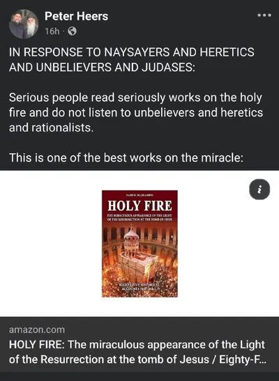 В ОТВЕТ ОТРИЦАТЕЛЯМ, ЕРЕТИКАМ, НЕВЕРУЮЩИМ И ИУДЕЙСТВУЮЩИМ: Серьезные люди серьезно читают труды о Благодатном огне и не слушают неверующих, еретиков и рационалистов. Это одна из лучших работ о чуде: