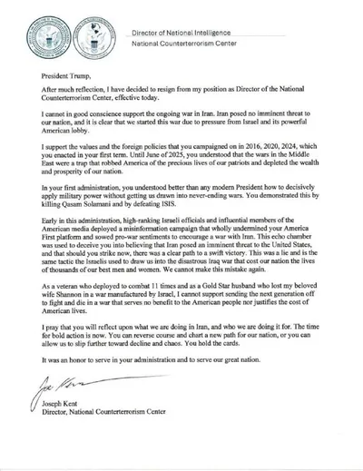 Глава контр-террористического центра США Джо Кент ушел в отставку из-за того, что не согласен с военной операцией против Ирана: «Иран не представлял непосредственной угрозы для нашей страны, и, очев