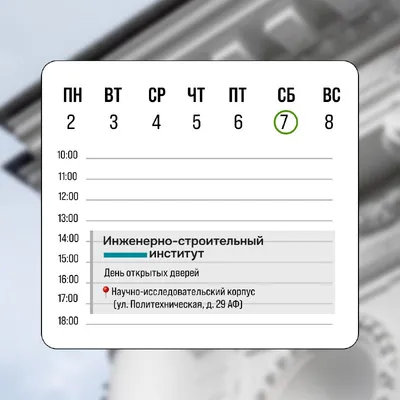 День открытых дверей Инженерно-строительного института 7 марта, 14:00 Научно-исследовательский корпус (ул. Политехническая, 29АФ) На Дне открытых дверей вы сможете: 🔵познакомиться с образовательны