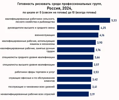 Готовность рисковать среди профессиональных (квалификационных) групп россиян (по основной выполняемой работе), 2024 г. Показатель — средний балл по шкале от 0 (совсем не готовы рисковать) до 10 (всег