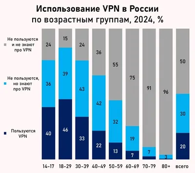 Использование VPN россиянами по возрастным группам, 2024 г., %. Ответы актуальны на период, когда YouTube уже заблокировали (“замедлили”), а WhatsApp и Telegram еще не начали блокировать, замедлять и